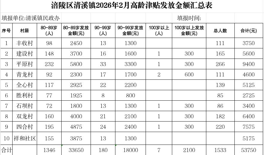 涪陵区清溪镇2026年2月高龄津贴发放金额汇总表