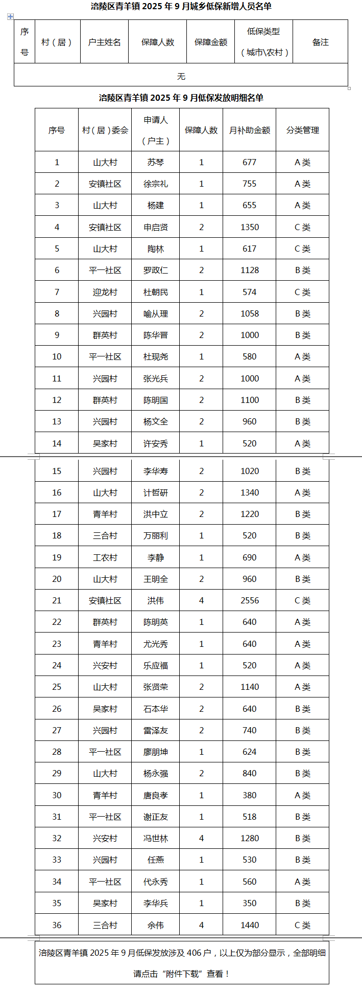 涪陵区青羊镇2025年9月城乡低保新增人员及个人发放明细表