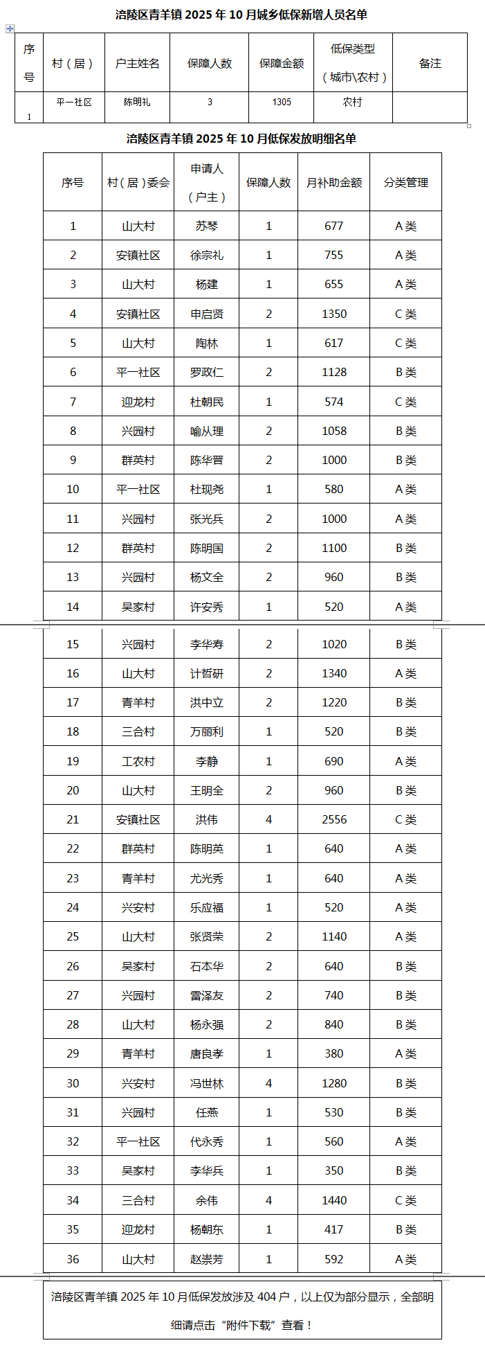 涪陵区青羊镇2025年10月城乡低保新增人员及个人发放明细表