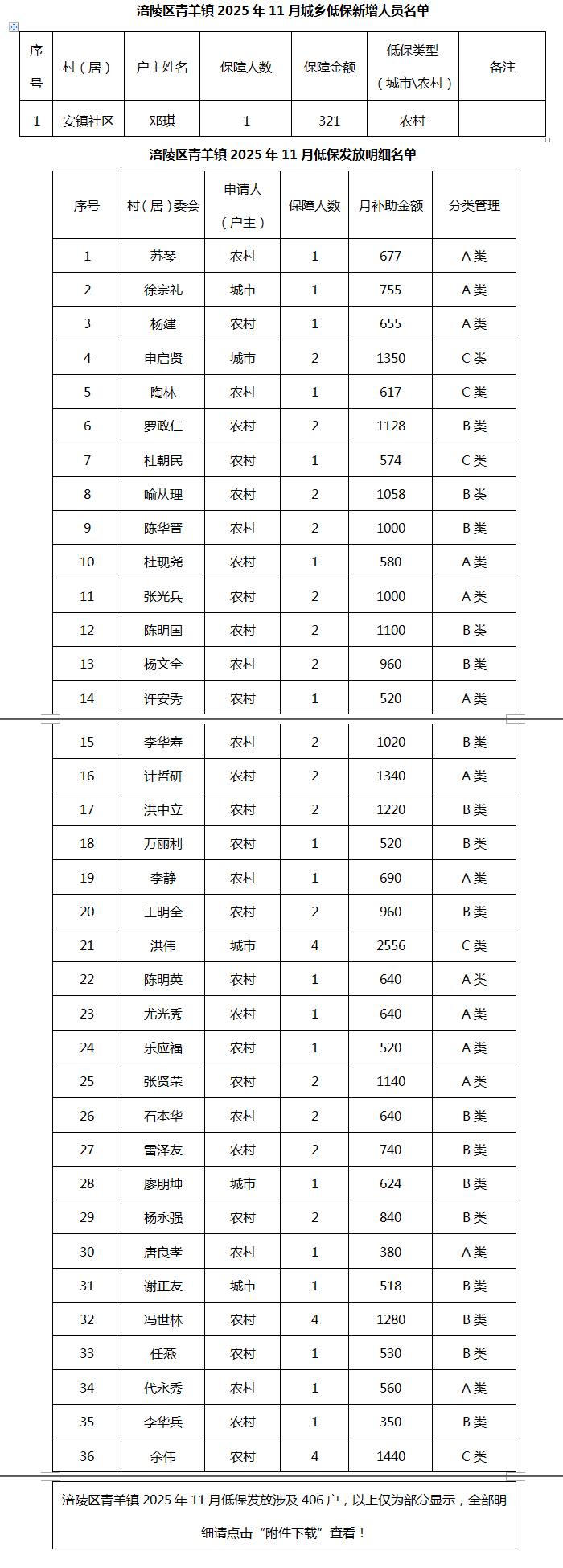 涪陵区青羊镇2025年11月城乡低保新增人员及个人发放明细表