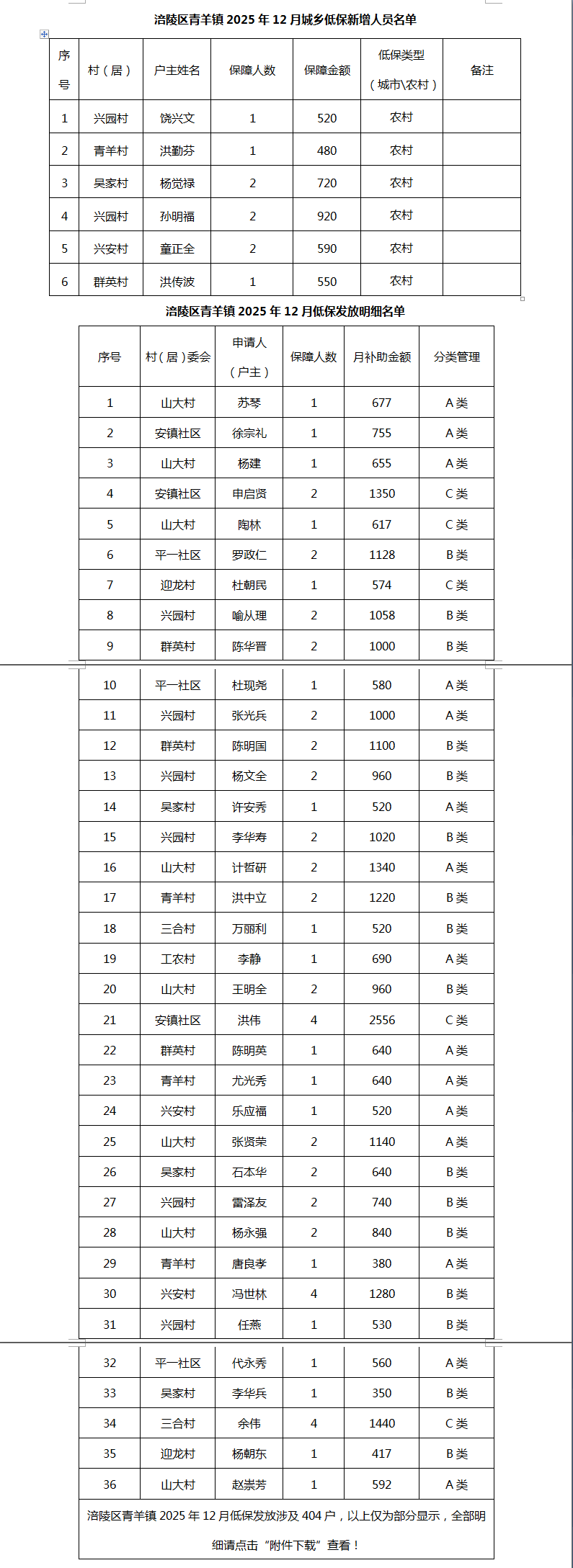 涪陵区青羊镇2025年12月城乡低保新增人员及个人发放明细表