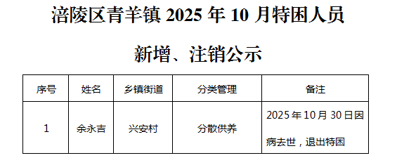 涪陵区青羊镇2025年10月特困人员新增、注销公示