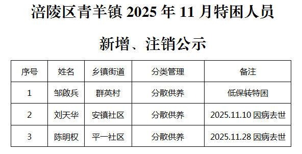 涪陵区青羊镇2025年11月特困人员新增、注销公示