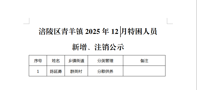 涪陵区青羊镇2025年12月特困人员新增、注销公示