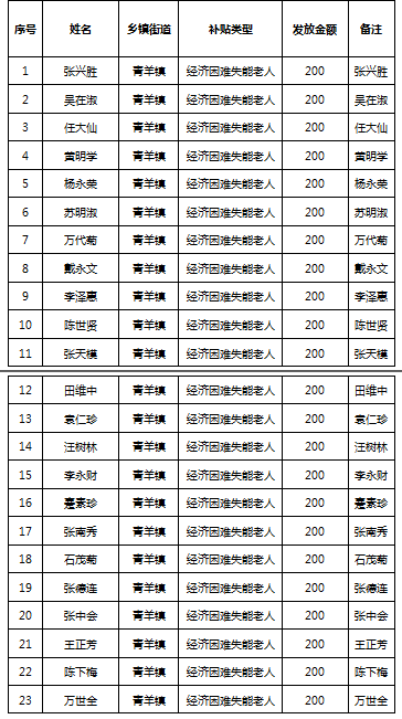 涪陵区青羊镇2025年8月经济困难的高龄失能老年人养老服务补贴发放花名册