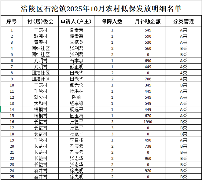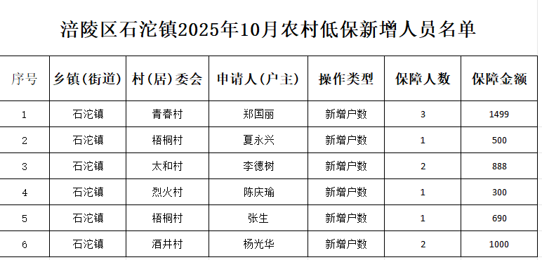 涪陵区石沱镇2025年10月农村低保新增人员及发放明细名单