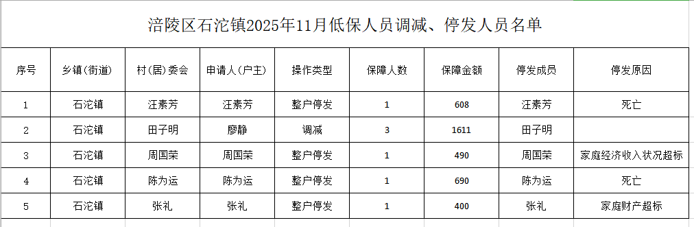 涪陵区石沱镇2025年11月低保人员调减、停发人员名单