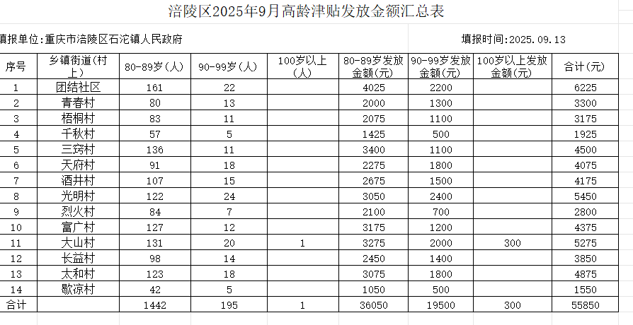 涪陵区石沱镇高龄津贴明细汇总表(2025年9月)