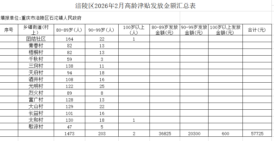 涪陵区石沱镇高龄津贴明细汇总表(2026年2月)