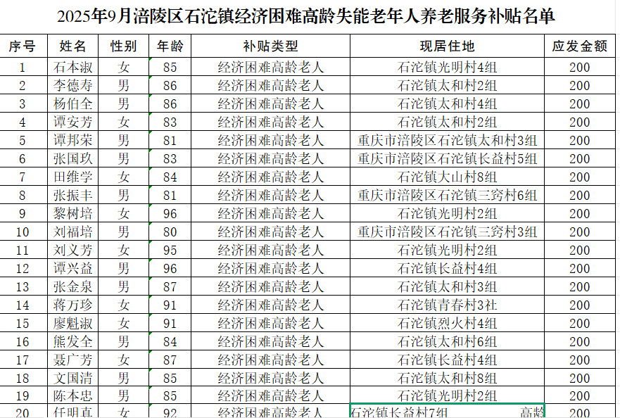 2025年9月涪陵区石沱镇经济困难高龄失能老年人养老服务补贴名单