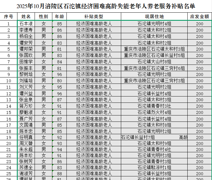 2025年10月涪陵区石沱镇经济困难高龄失能老年人养老服务补贴名单