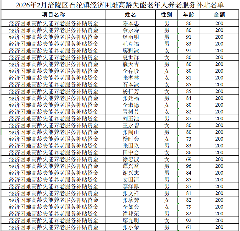 2026年2月涪陵区石沱镇经济困难高龄失能老年人养老服务补贴名单