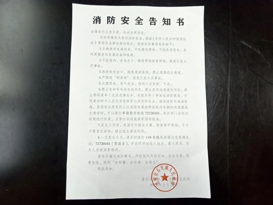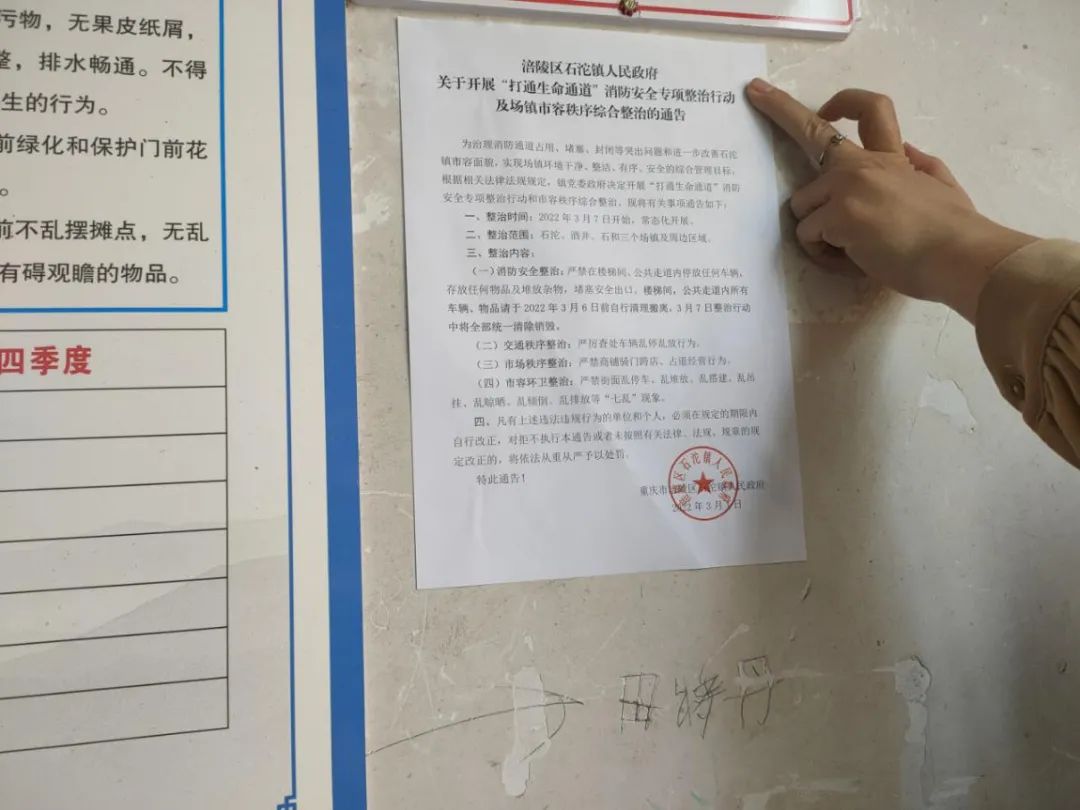 张贴《消防安全告知书》和《关于开展“打通生命通道”消防安全专项整治行动及场镇市容秩序综合整治的通告》专项整治暨宣传行动从今年3月7日开始,将常态化保持整治和宣传力度,整治范围涵盖石沱、酒井、石和三个场镇及周边区域、居民点等重点区域,整治内容主要是严禁在楼梯间、公共走廊过道内停放任何车辆,存放任何物品及堆放杂物,堵塞安全出口;宣传内容包括日常生活中的用火、用电、用气安全常识,楼道内禁止停放车辆、堆放杂物、飞线充电等消防知识。