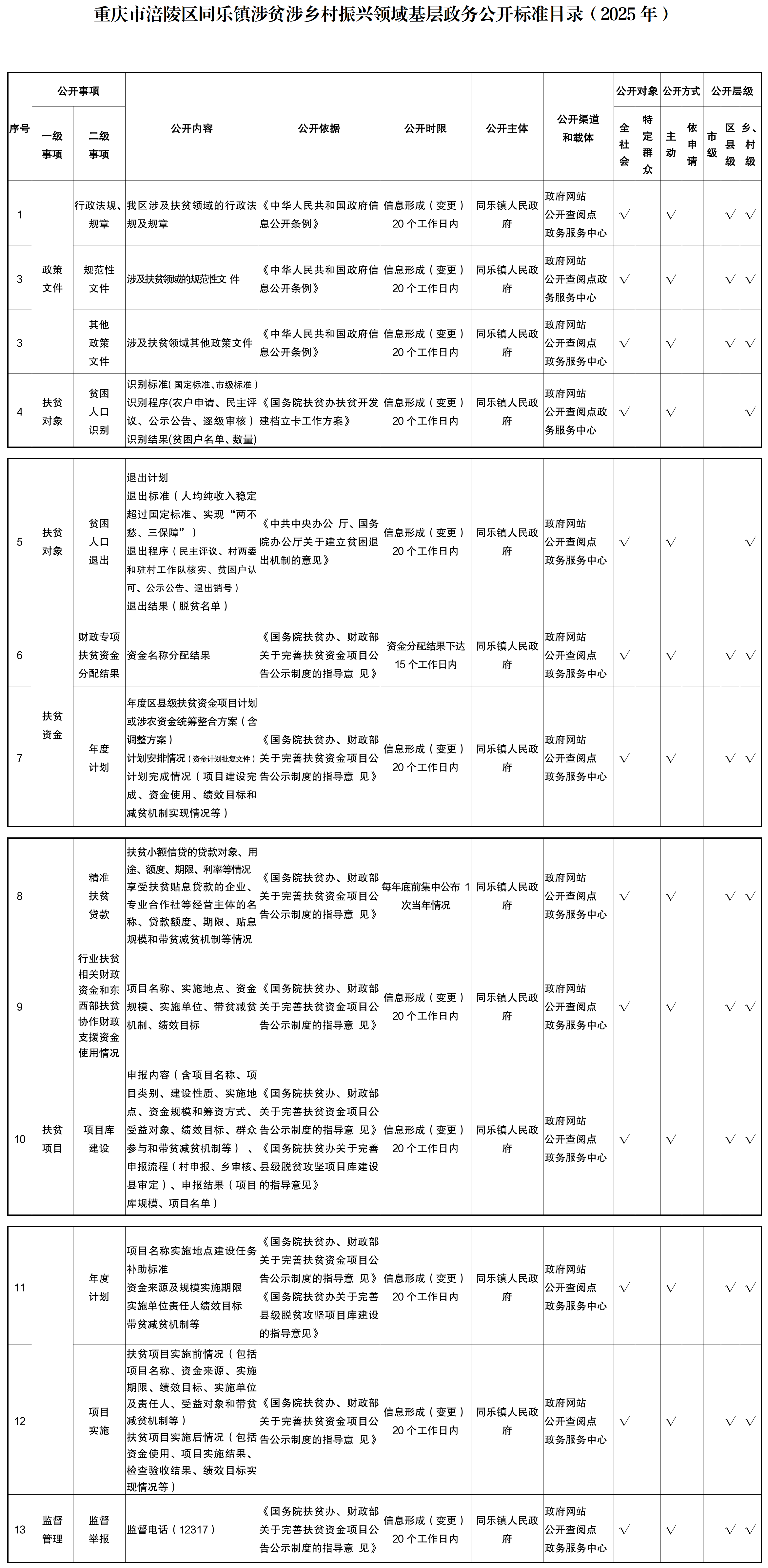 重庆市涪陵区同乐镇涉贫涉乡村振兴领域基层政务公开标准目录(2025年版)