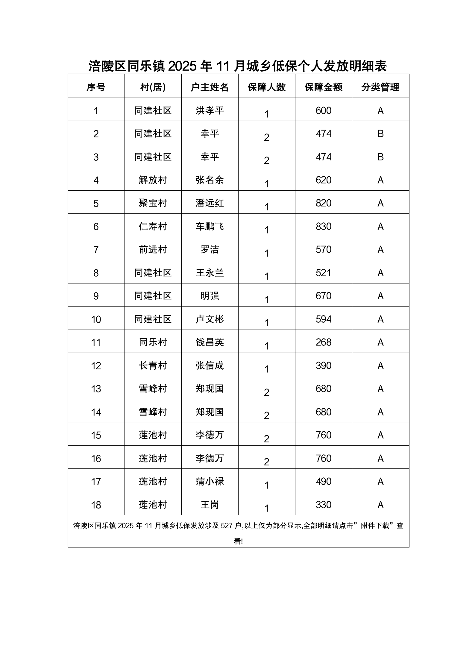 涪陵区同乐镇2025年11月城乡低保个人发放明细表