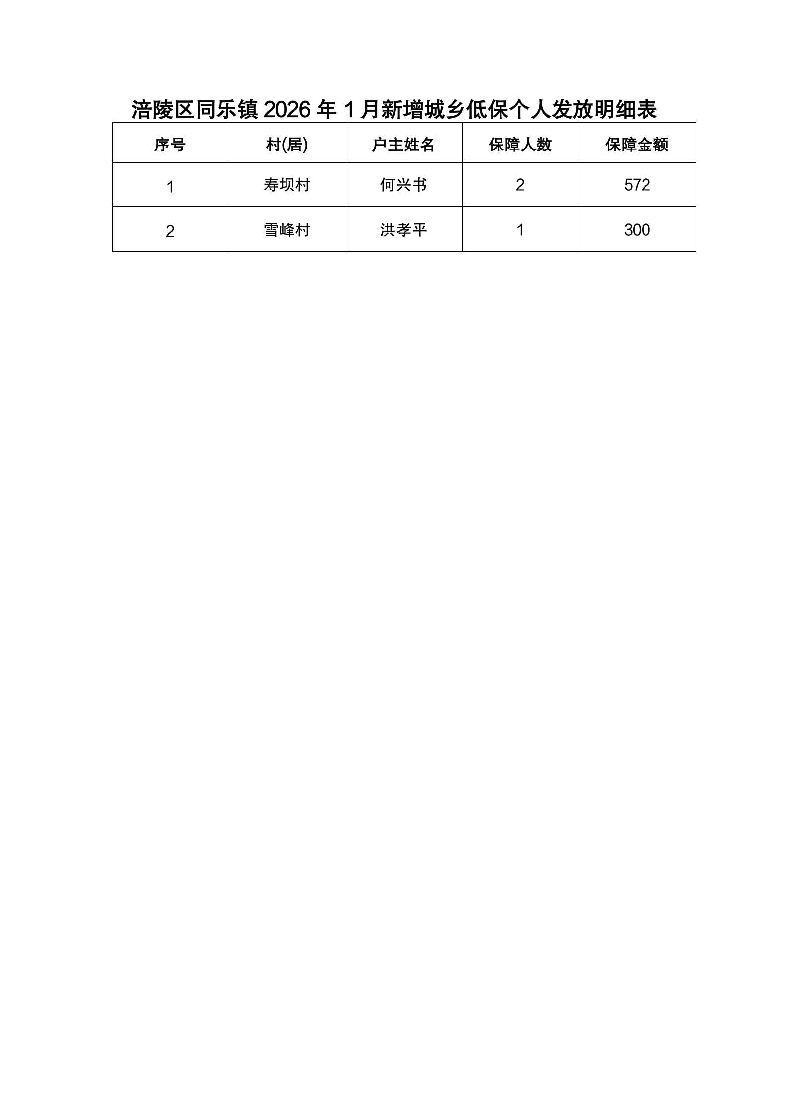 涪陵区同乐镇2026年1月新增低保人员公示
