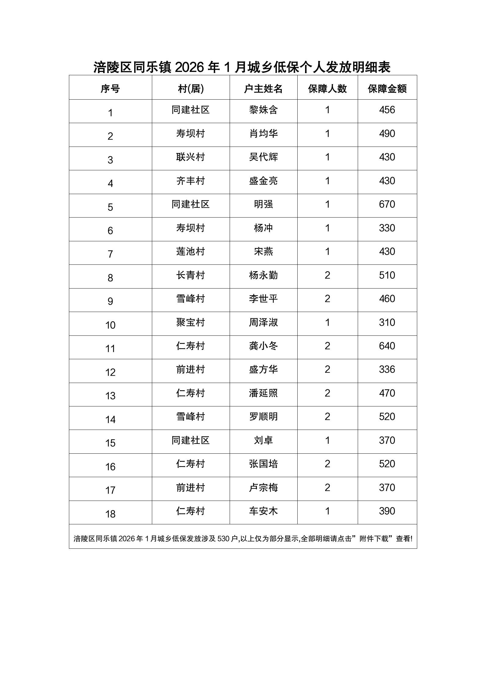 涪陵区同乐镇2026年1月城乡低保个人发放明细表