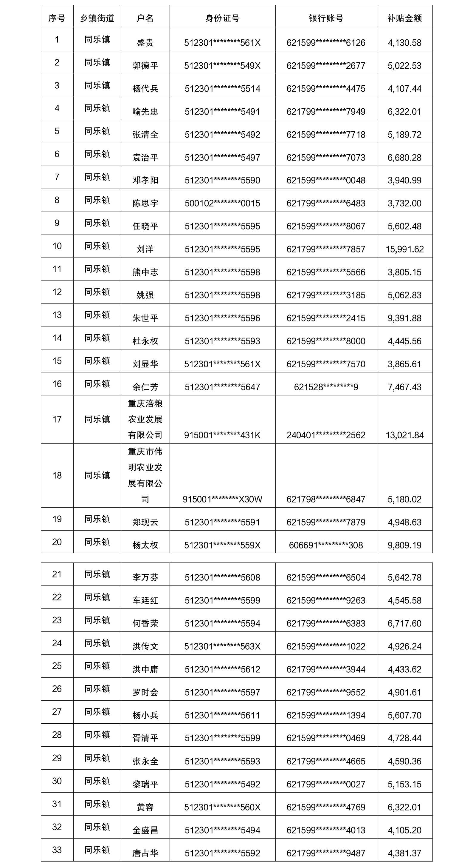 2024年,涪陵区同乐镇补贴种粮大户33户,补贴金额193773.45元。