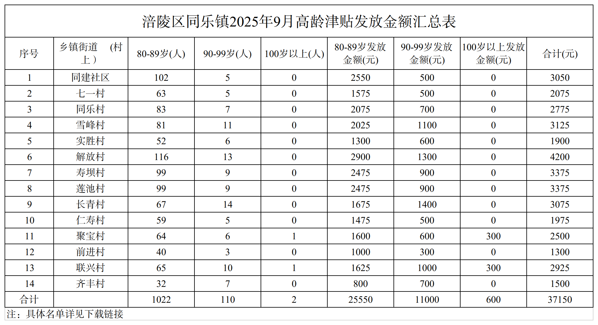 涪陵区同乐镇2025年9月高龄津贴发放金额汇总表