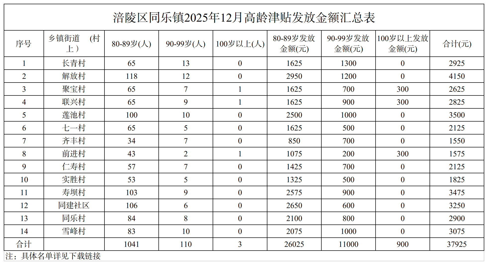 涪陵区同乐镇2025年12月高龄津贴发放金额汇总表