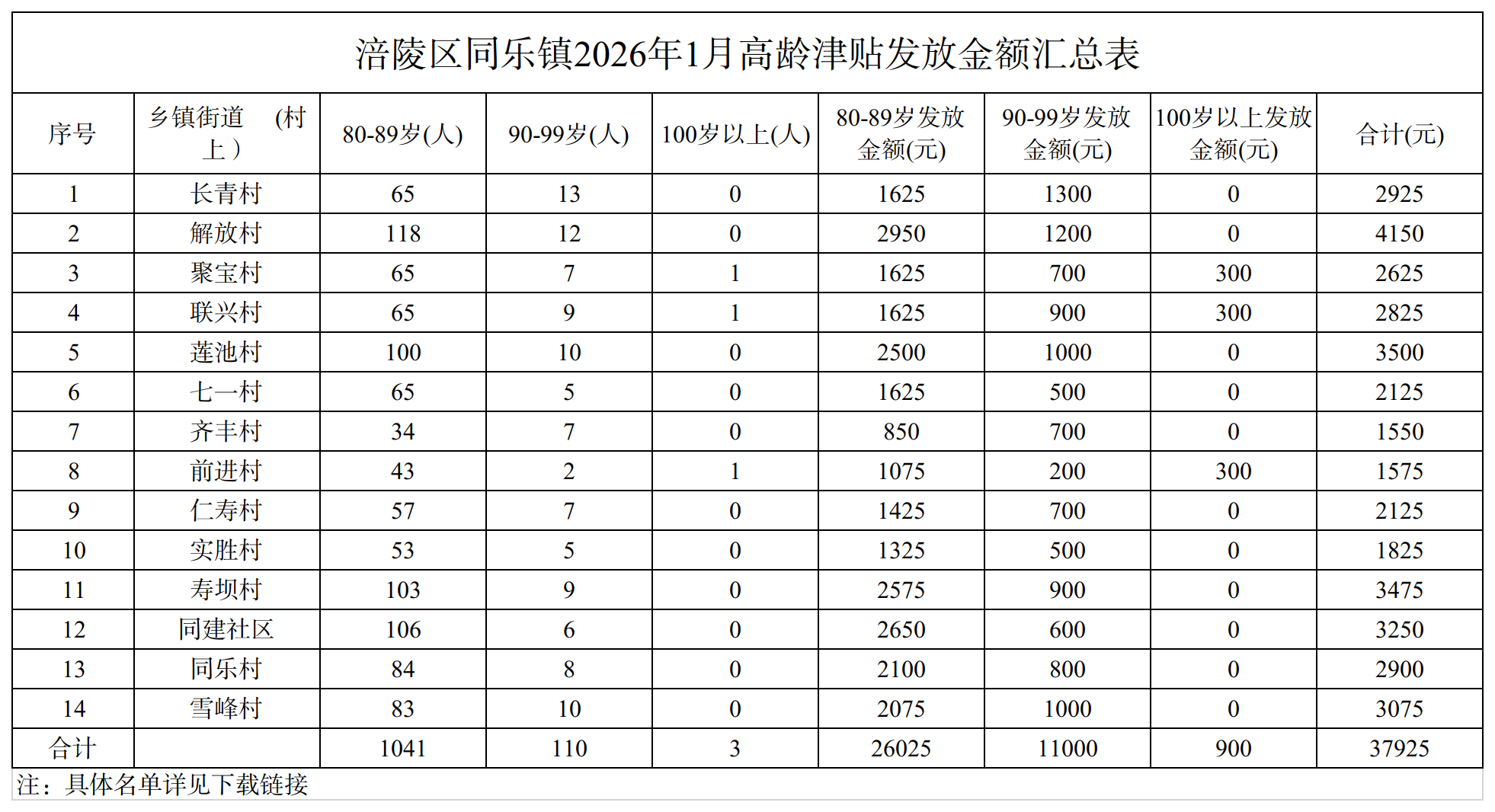 涪陵区同乐镇2026年1月高龄津贴发放金额汇总表