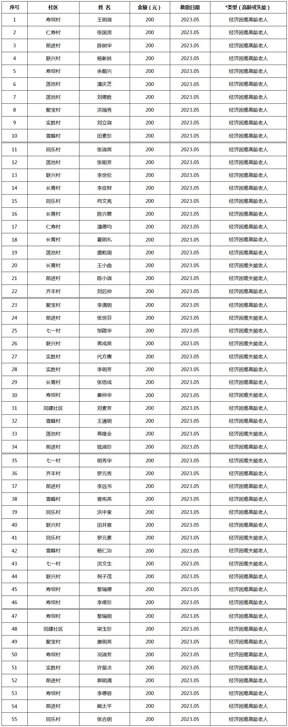 2023年5月涪陵区同乐镇经济困难高龄失能老年人养老服务补贴名单