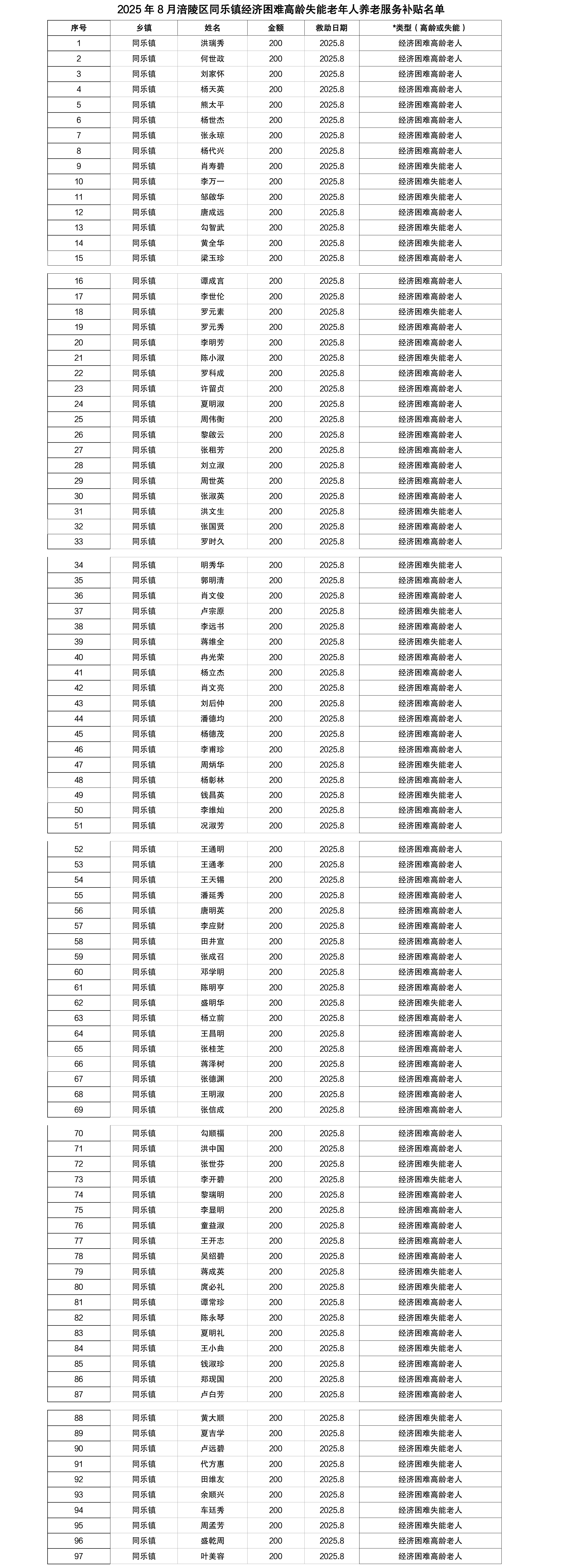 涪陵区同乐镇2025年8月经济困难高龄失能老年人养老服务补贴名单