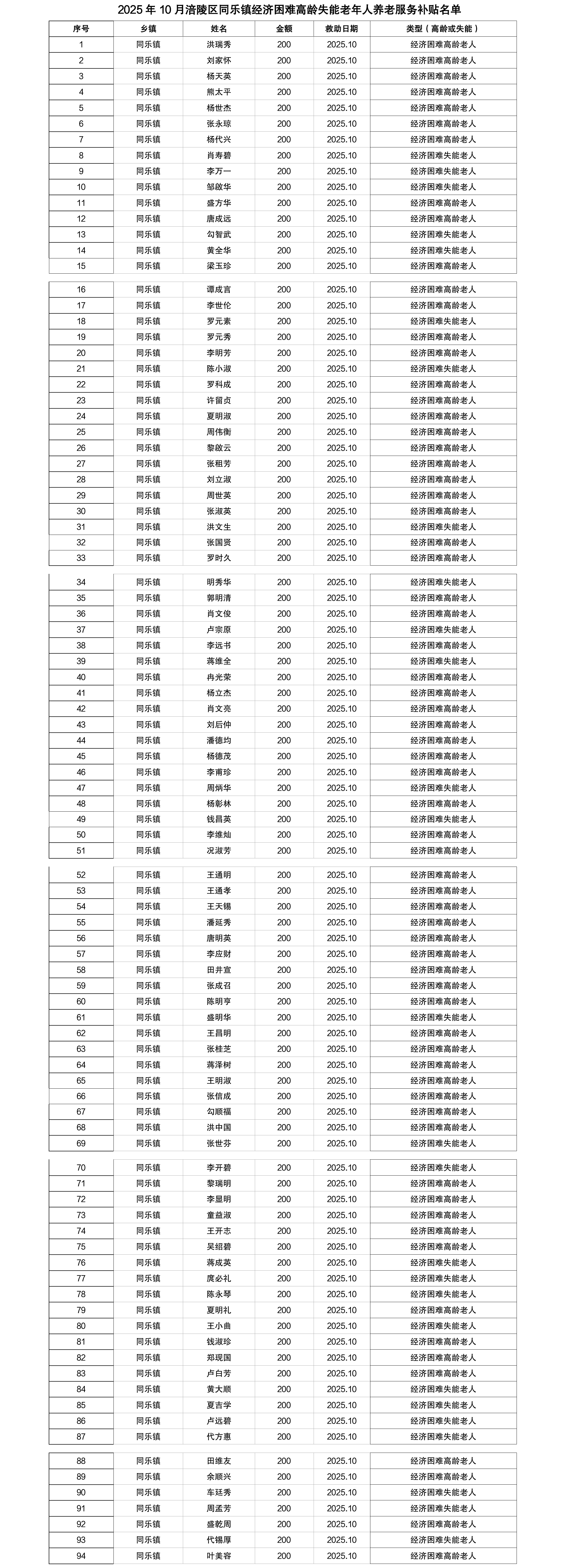 涪陵区同乐镇2025年10月经济困难高龄失能老年人养老服务补贴名单