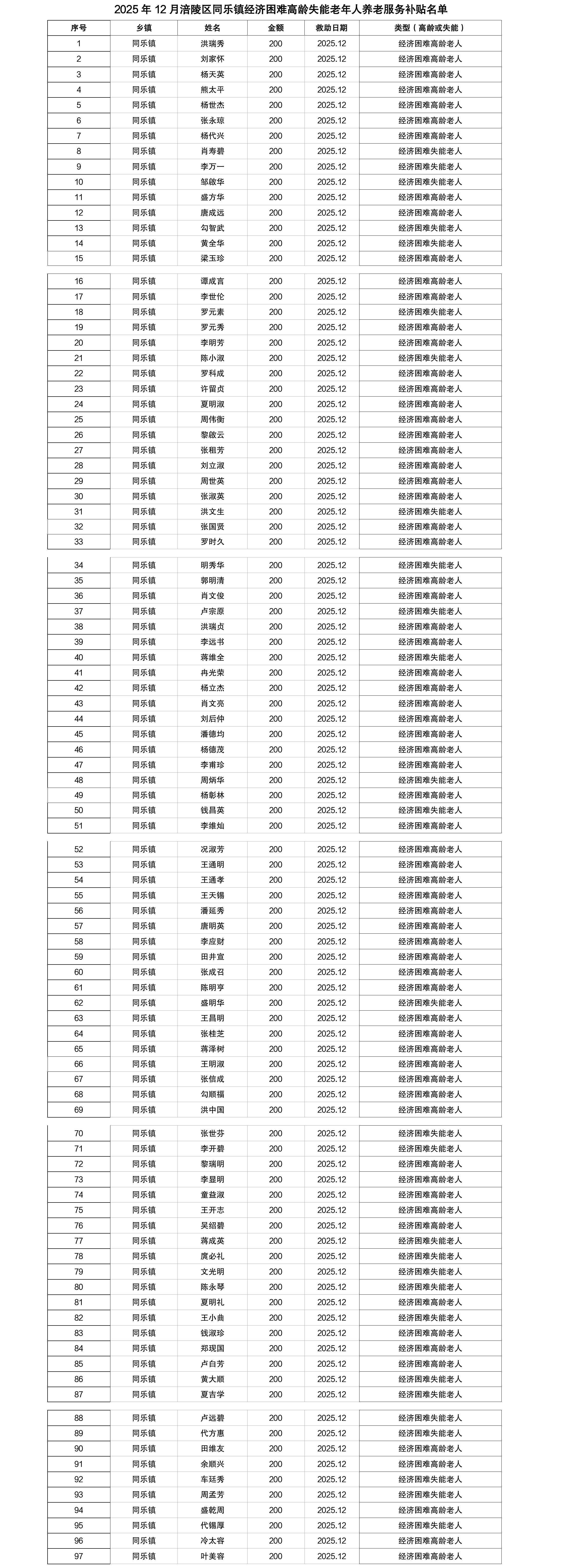 涪陵区同乐镇2025年12月经济困难高龄失能老年人养老服务补贴名单