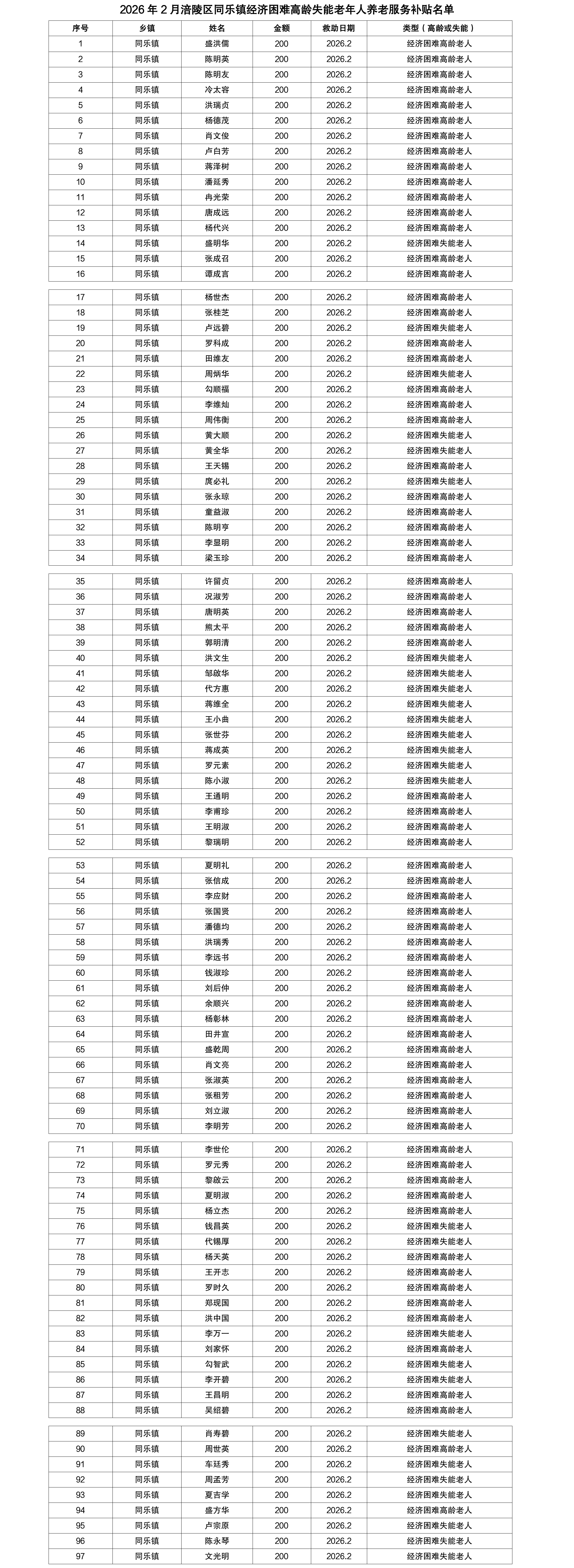 涪陵区同乐镇2026年2月经济困难高龄失能老年人养老服务补贴名单