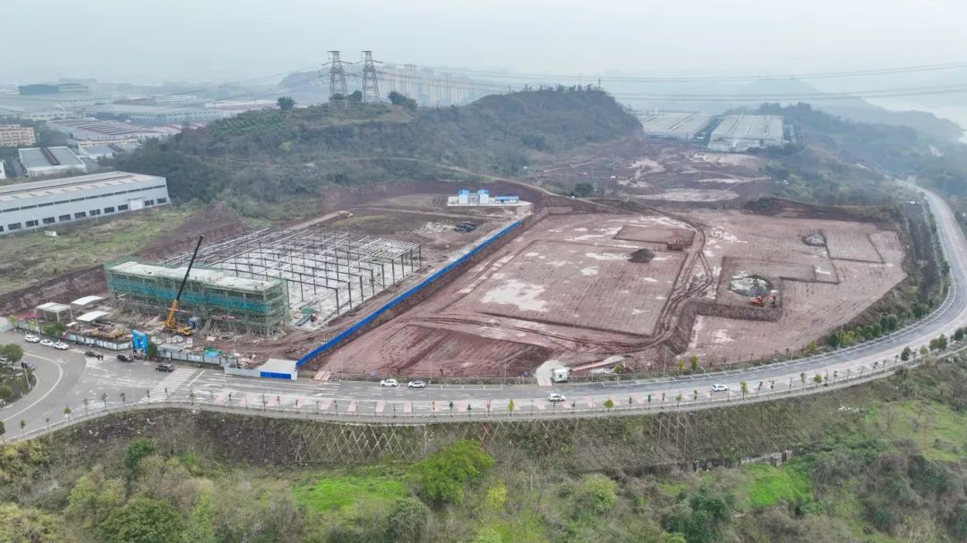 在项目(一期)施工现场,钢结构厂房和框架结构研发中心均已实现主体封顶,厂区道路已完成路基施工,工人们正在为下一步屋面、墙面、水稳层铺设等施工做前期准备工作。