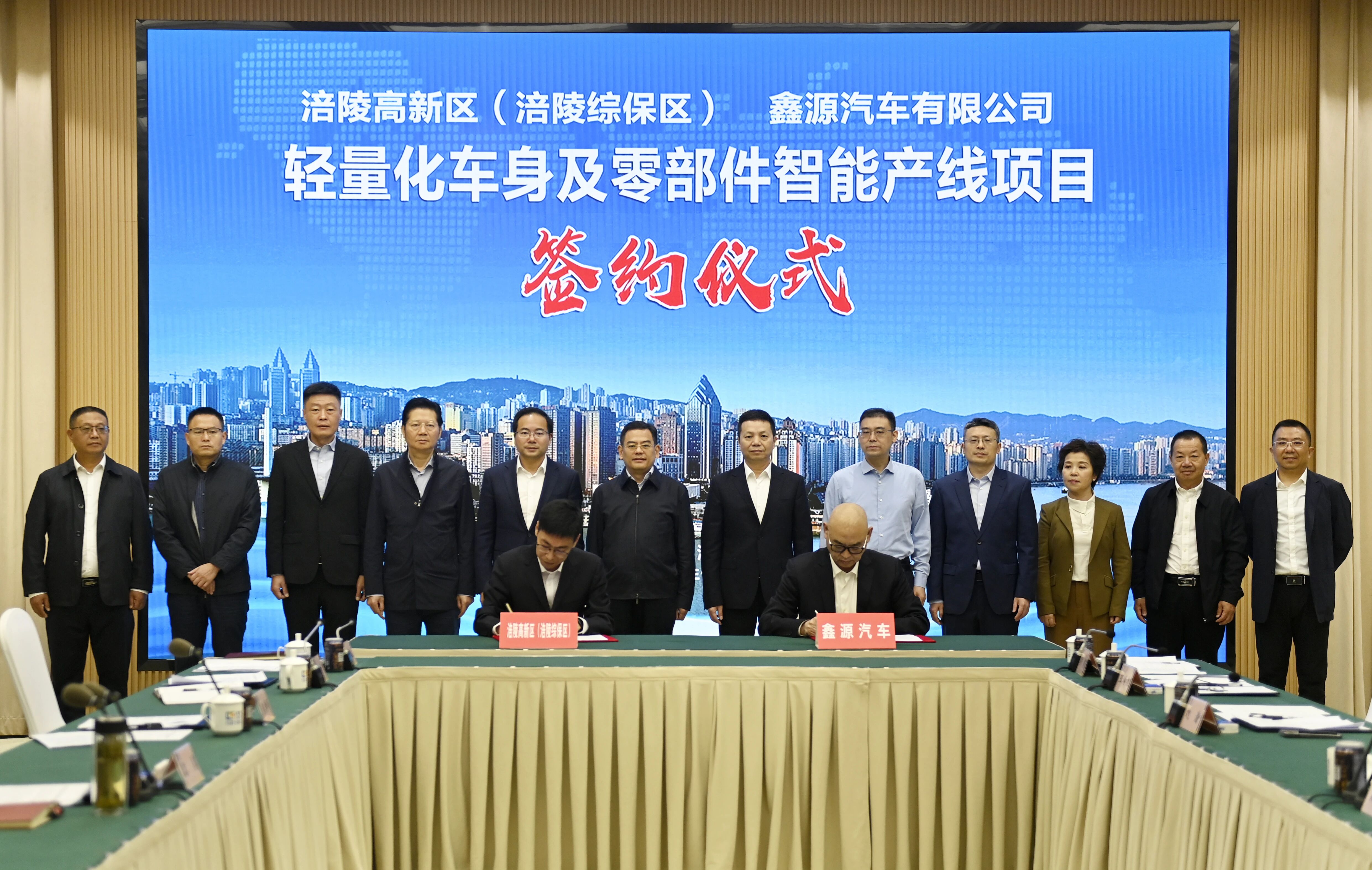 10月22日,涪陵区与鑫源汽车有限公司签订轻量化车身及零部件智能产线项目合作协议,该项目总投资约52亿元,建成达产后预计年产值超百亿元。涪陵区委书记黎勇,区委副书记、区政府区长董奕锋,区政协主席杜海波与鑫源集团董事长龚大兴一行座谈并见证签约。鑫源集团副董事长、鑫源汽车有限公司总经理谢勇,鑫源集团董事刘渝、周隆林,涪陵区领导邓远峰、冯星贵、阳森参加。