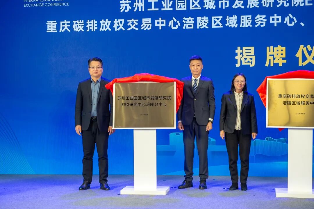 11月15日,重庆国际人才交流大会绿色低碳产业人才发展暨美丽中国建设先行区(涪陵)高质量发展大会在涪陵成功举办。会上,重庆市涪陵区委常委、涪陵高新区(综保区)党工委书记邓远峰,苏州新建元城市发展公司副总经理、苏州工业园区城市发展研究院负责人吴学军为苏州工业园区城市发展研究院ESG研究中心涪陵分中心揭牌。