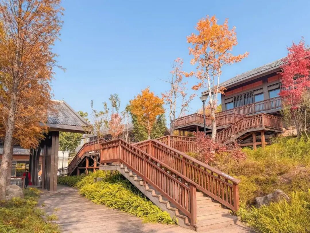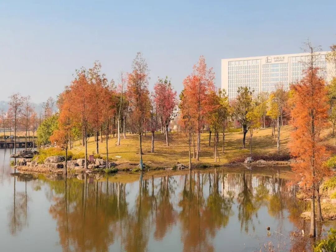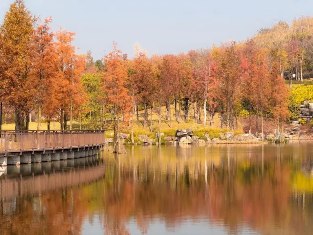 沿入口步道前行,红枫与水杉织就天然画屏——枫叶红得似霞,水杉赭得如陶,叶片在正午阳光下泛着油润的光,风过之时,簌簌落下的叶瓣,为草坪铺就柔软的“自然地毯”。这片错落的林木不仅是美景担当,更是城市的“绿肺”,每一口呼吸都浸着草木的清新,这是公园生态涵养功能最直观的馈赠。