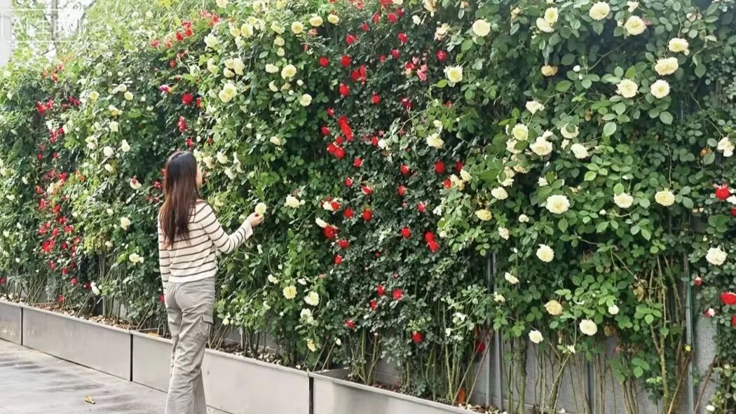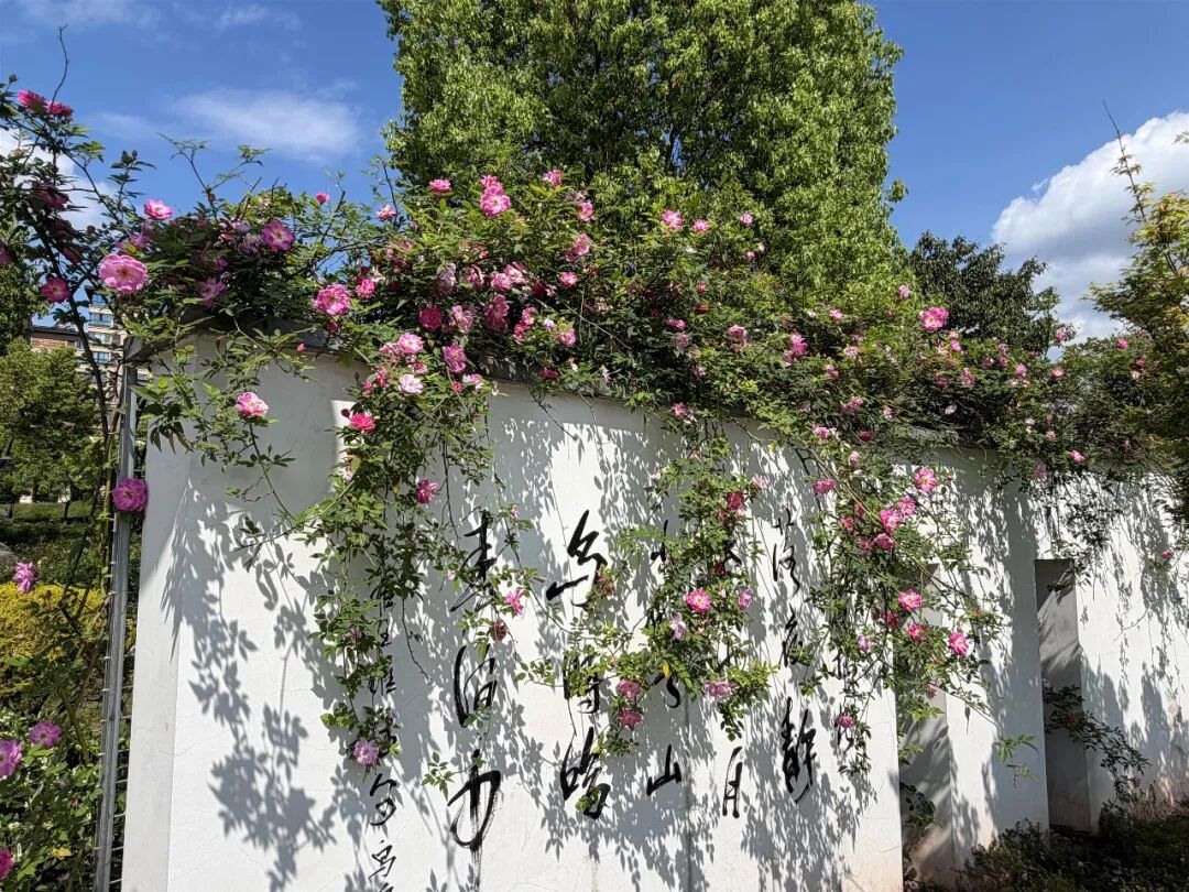 城市绿化不仅在于平面铺展,更在于立体提质、全域增绿。在铜鼓湖湿地公园的文化墙区域,工作人员通过种植蔷薇,打造立体绿化景观,让原本单调的墙面变身柔美生动的鲜花背景墙。阳光透过枝叶缝隙洒落,在地面形成斑驳灵动的光影,微风轻拂,光影流转;各色蔷薇花枝从叶间探出,层层花瓣轻柔舒展,尽显春日的柔美与灵动。