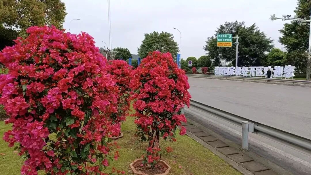 涪陵高新区(综保区)聚业大道绿化带绽放的三角梅