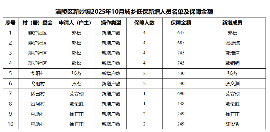 涪陵区新妙镇2025年10月城乡低保新增人员名单及保障金额
