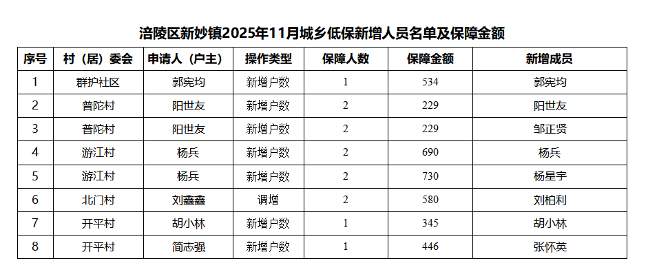 涪陵区新妙镇2025年11月城乡低保新增人员名单及保障金额