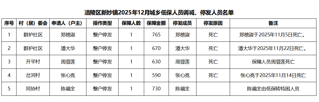 涪陵区新妙镇2025年12月城乡低保人员调减、停发人员名单