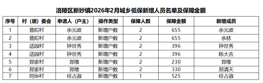 涪陵区新妙镇2026年2月城乡低保新增人员名单及保障金额