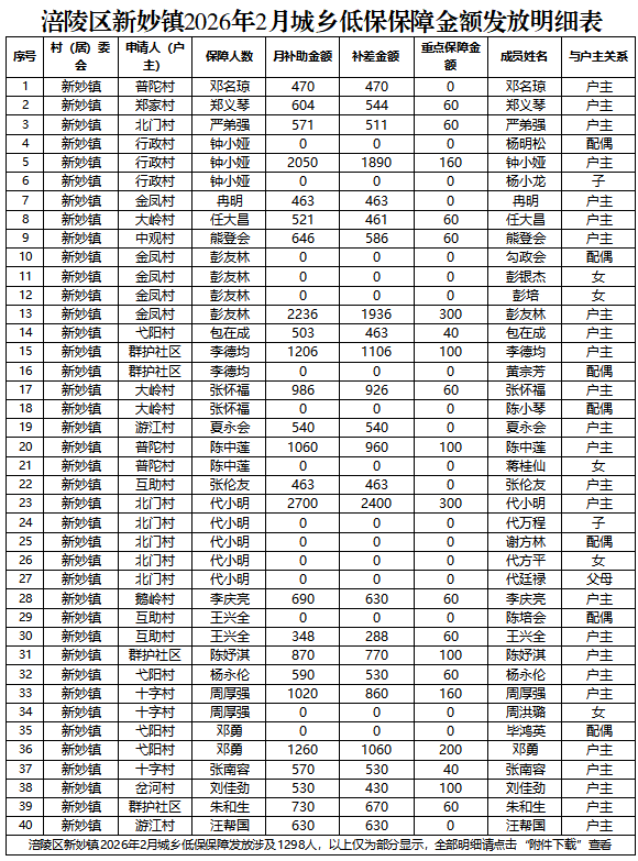 涪陵区新妙镇2026年2月城乡低保保障金额发放明细表