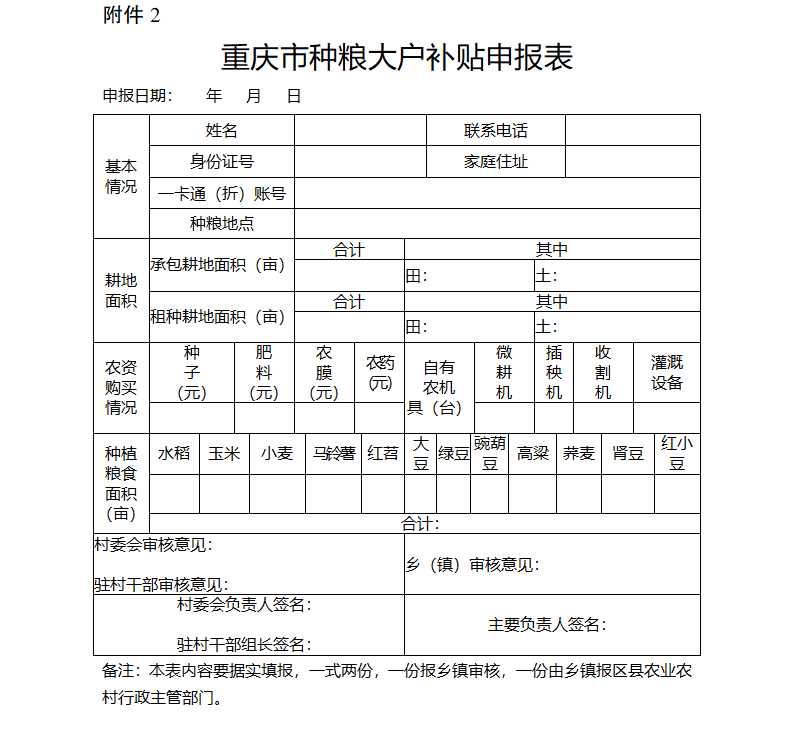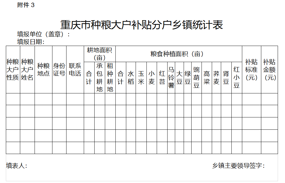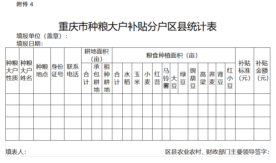 4.补贴程序。实行区县核准、市级备案制。各区县对种粮大户的真实性、合规性、准确性负责。乡镇人民政府、区县农业农村部门、财政部门负责对种粮大户进行核实,区县财政部门负责核拨补贴资金。种粮大户、乡镇人民政府、区县农业农村部门和财政部门要分别填报《重庆市种粮大户补贴申报表》(附件2)、《重庆市种粮大户补贴分户乡镇统计表》(附件3)、《重庆市种粮大户补贴分户区县统计表》(附件4)。种粮大户须按要求提供土地流转证明和身份证复印件,对代种撂荒地的,应由乡镇政府、村出具种粮证明;新开垦未发包耕地、村社集体机动地种植的,应由乡镇、村级及国土部门出具土地面积和性质相关证明。种粮大户补贴核实结果必须坚持区县、乡镇、村社三级两次公示,每次公示时间不少于7天,对有异议的,重新查实审核后再公示。