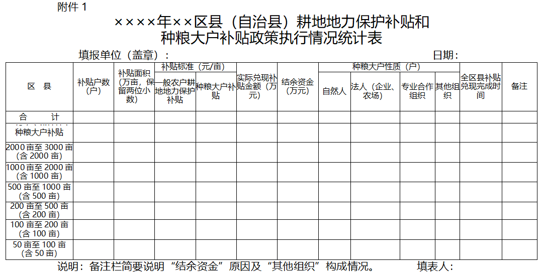 1.××××年××区县(自治县)耕地地力保护补贴和种粮大户补贴政策执行情况统计表