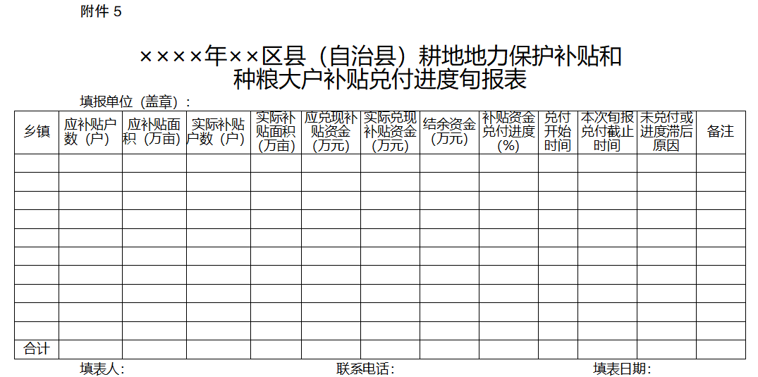 5.××××年××区县(自治县)耕地地力保护补贴和种粮大户补贴兑付进度旬报表