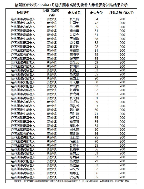涪陵区新妙镇2025年11月经济困难高龄失能老人养老服务补贴结果公示