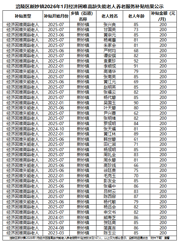 涪陵区新妙镇2026年1月经济困难高龄失能老人养老服务补贴结果公示
