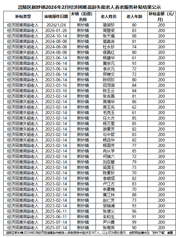 涪陵区新妙镇2026年2月经济困难高龄失能老人养老服务补贴结果公示