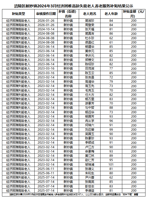 涪陵区新妙镇2026年3月经济困难高龄失能老人养老服务补贴结果公示