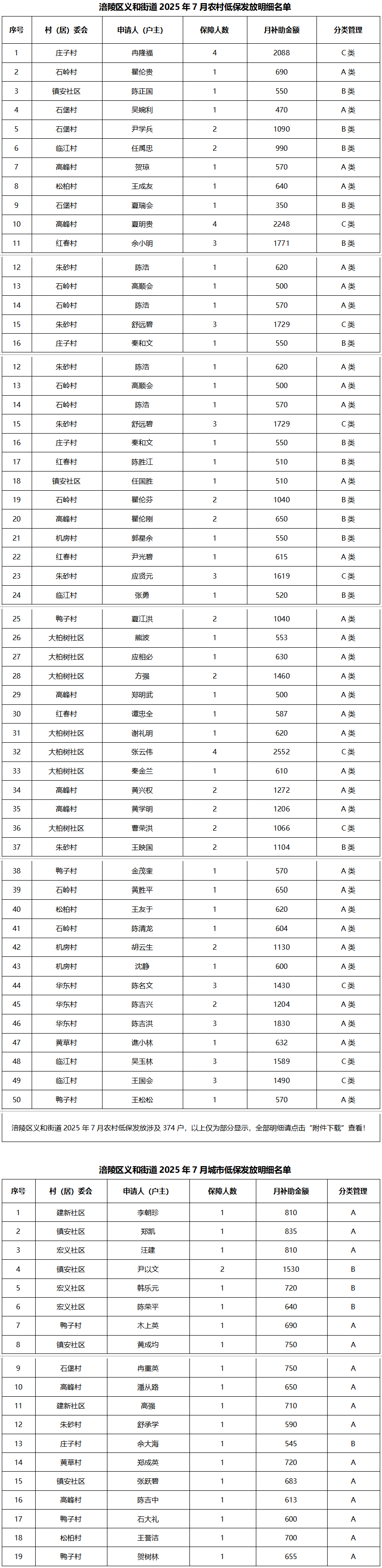 涪陵区义和街道2025年7月城乡低保新增人员及个人发放明细表