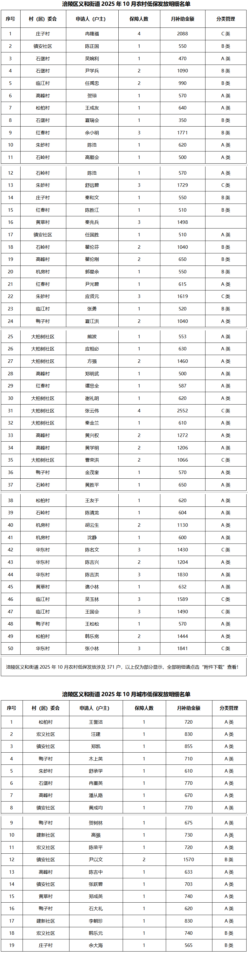涪陵区义和街道2025年10月城乡低保新增人员及个人发放明细表